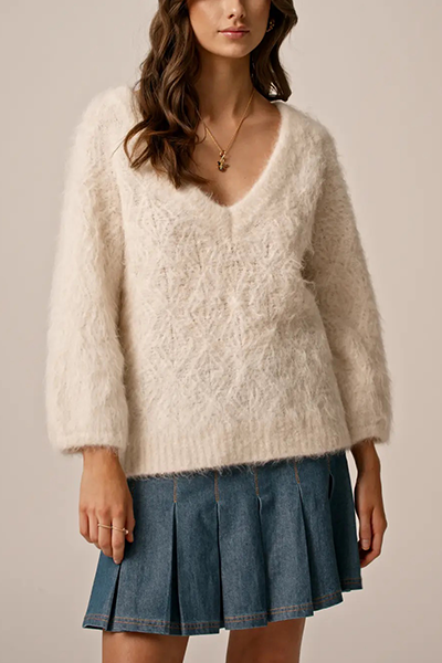 Detaljer: Genseren har en løs fasong dyp v-hals, armer med vidde og er normal i størrelsen.