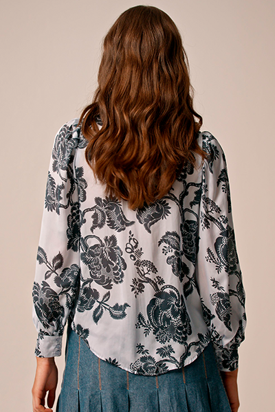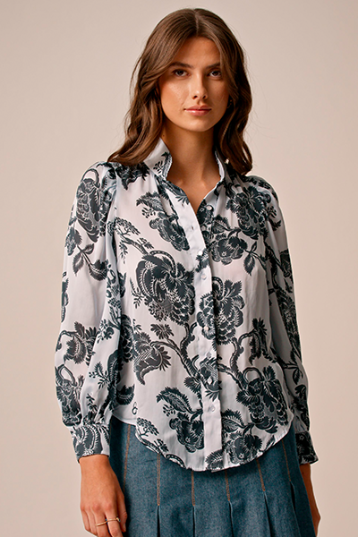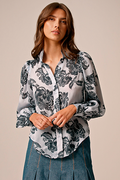 Detaljer: Blusen har lav krage, transparente puffarmer, åpne knappestolpe i front og en løs fasong. Blusen er normal i størrelsen.
