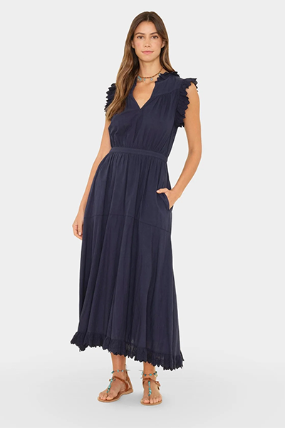 Detaljer: Kjolen har v-hals, rysjekant med ton i ton broderier rundt armer, krage og nederst ved bein. Kjolen har lommer i siden, elastisk bånd i midjen og er normal i størrelsen.